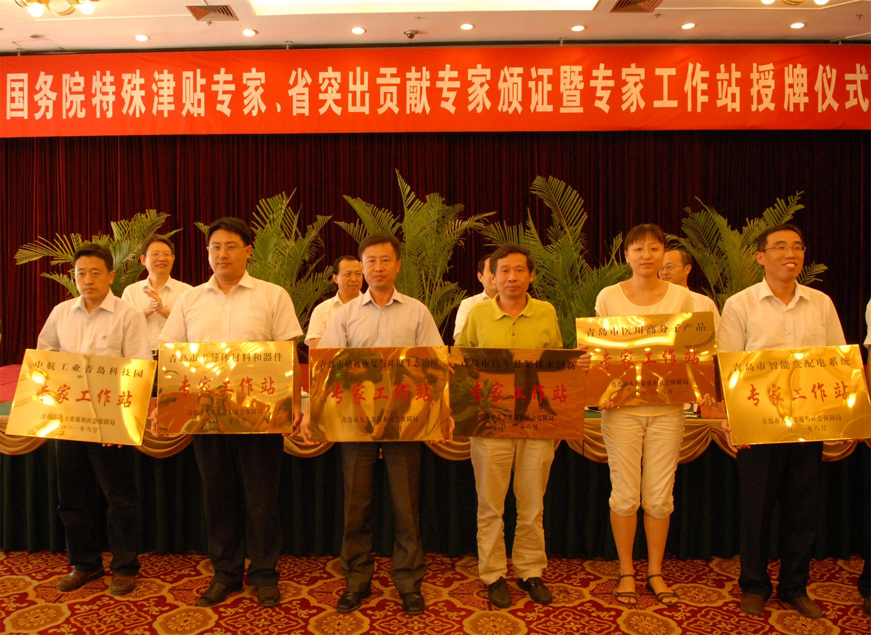 9月2日下午在市机关会议中心隆重举行“国务院特殊津贴专家、省突出贡献专家颁证暨专家工作站授牌仪式”, 出席此次仪式的有青岛市常务副市长王书坚、副市长王广正、市人社局局长、组织部常务副部长陈玉琦、市人社局副局长王德富等领导。